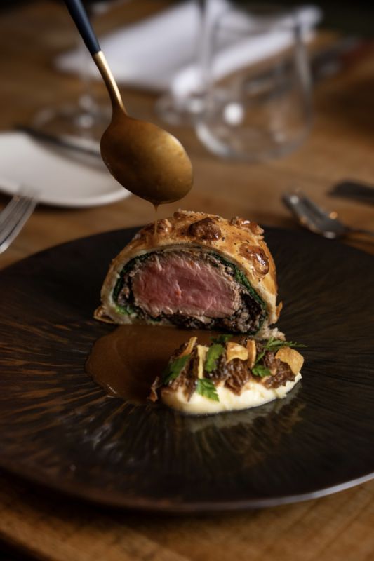 - telecí Wellington s máslovým listovým těstem, smrži, foie gras omáčkou a hedvábným bramborovým pyré.