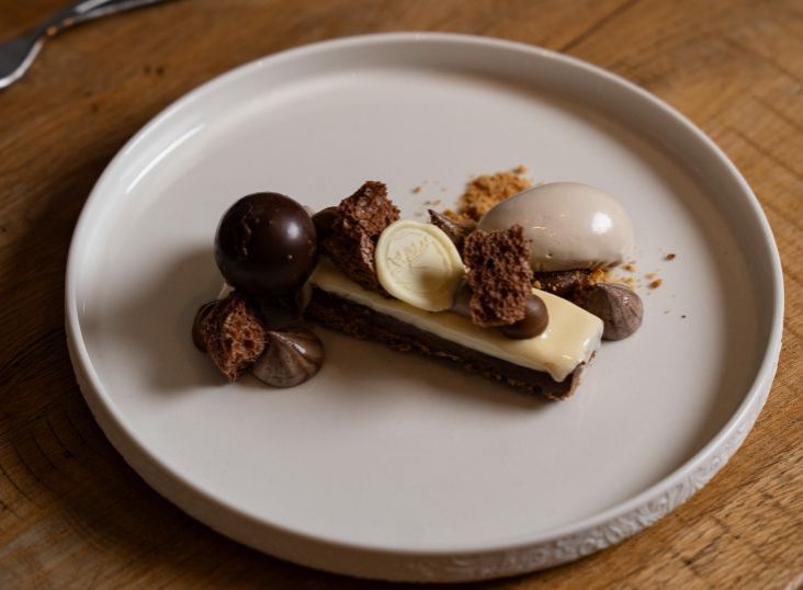 Romantický večer by nebyl kompletní bez dokonalého dezertu. Závěr patří sametové ganáži z čokolády Michel Cluizel, doplněné o Baileys, kávu a karamel. Kombinace, která se doslova rozplývá na jazyku a uzavírá celý večer v duchu smyslnosti a elegance.